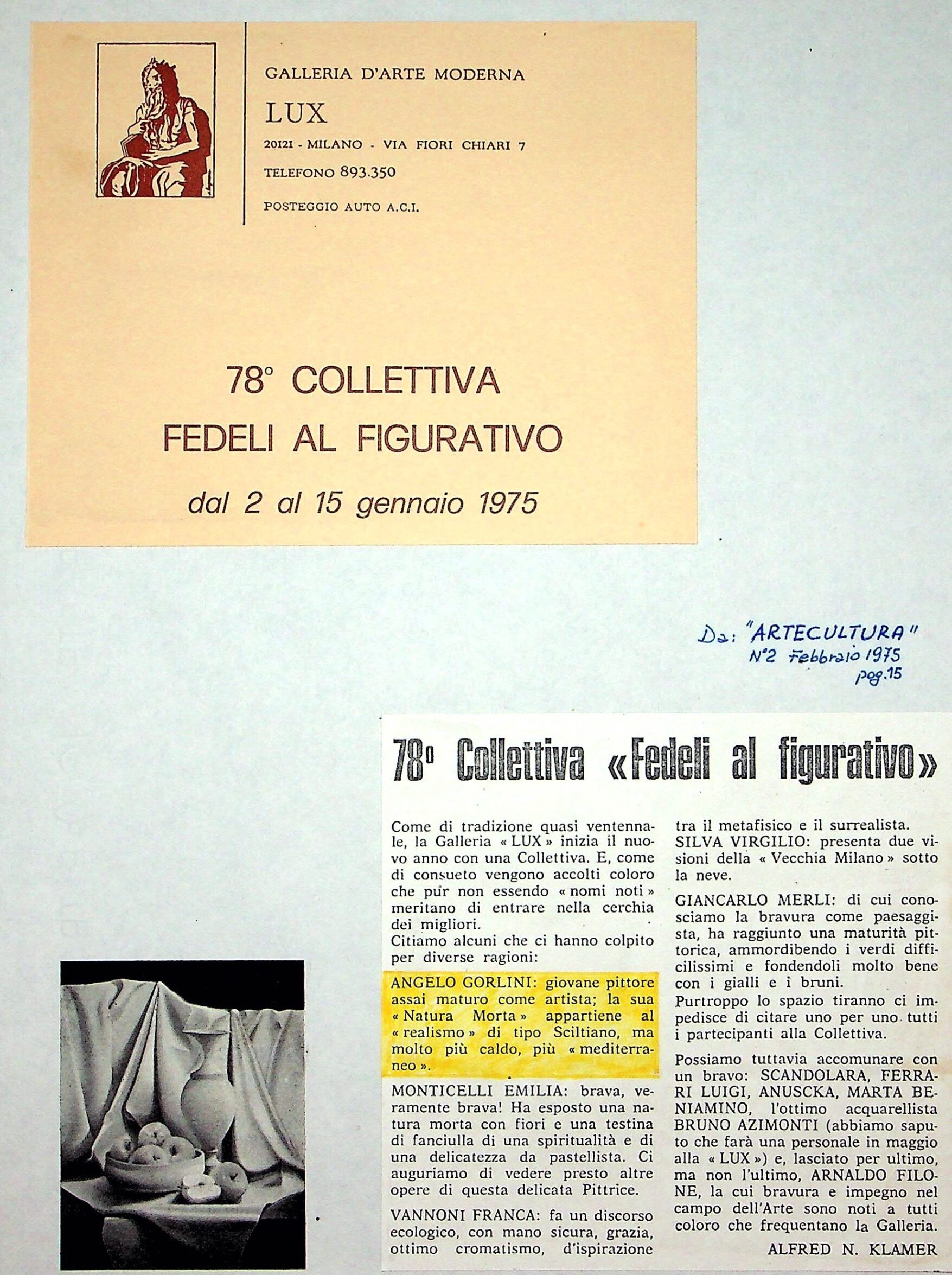 In quell’occasione oltre ad alcuni acquerelli, esposi anche un’opera realizzata con la tecnica pittorica ad olio che il critico d’arte Kramer commentò cosi: Angelo Gorlini, giovane pittore assai maturo come artista; la sua Natura Morta appartiene al realismo di tipo Sciltiano, ma molto più caldo, mediterraneo.