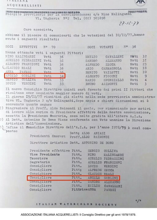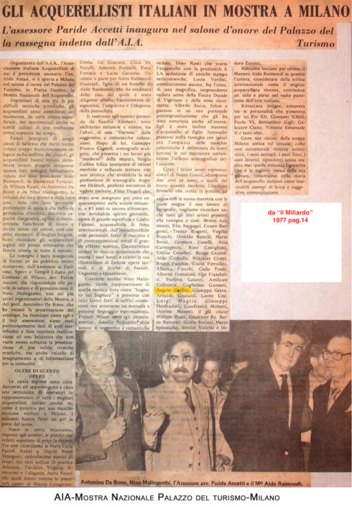 In quell’anno l’A.I.A organizzò una mostra Nazionale importantissima per quel momento, con esposizione nelle prestigiose sale dell’Arengario Milanese, ne segui un’altra presso l’Ente del Turismo. In quello stesso anno, rinnovò il suo Direttivo ed io ne feci parte.