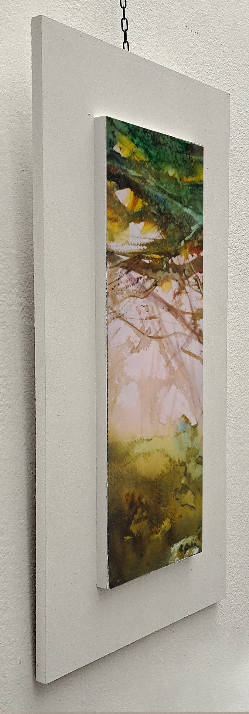 Per esaltare l’armonia del dipinto studio, studio e costruisco personalmente le cornici, senza vetro, per evitare riflessi e lasciare che lo sguardo incontri direttamente il colore, protetto solo da un velo di fissativo opaco e invisibile.