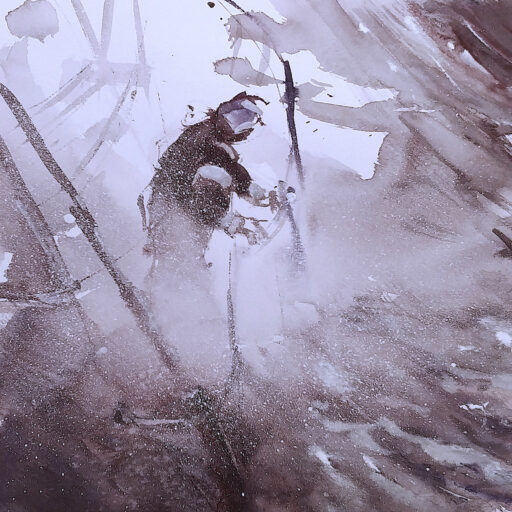 Un mare tempestoso, un pรฒ diverso dagli altri “mari” finora presentati, infatti in questa dimostrazione c’รจ un personaggio in primo piano che con la sua barca diventa un tuttuno con le onde, perchรจ solo cosi potrร convivere con esse.